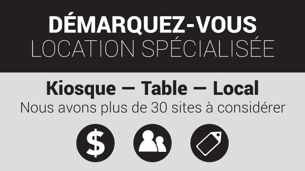 Vous désirez louer un espace commercial ou un kiosque pour une courte période ; contactez-nous, plusieurs possibilités s’offrent à vous!